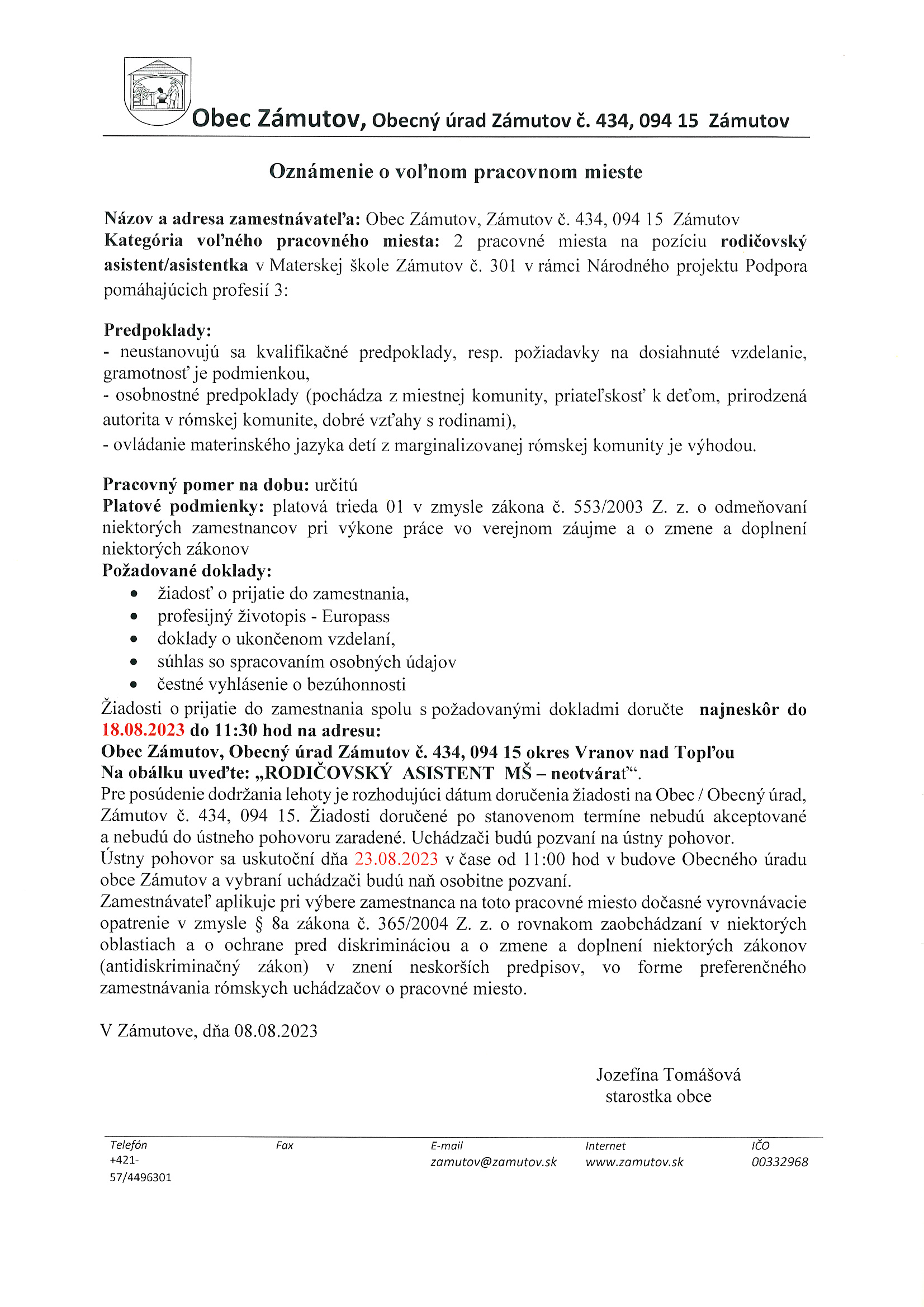 Oznámenie o voľnom pracovnom mieste – rodičovský asistent v MŠ č. 301